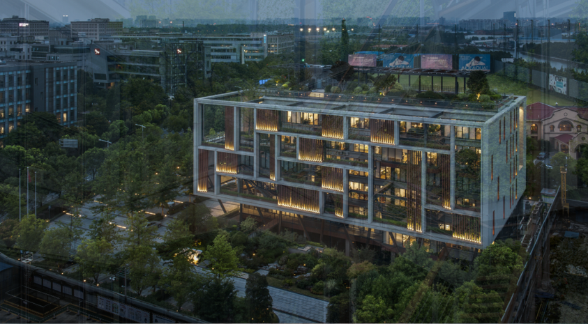 由华建集团华东建筑设计研究院有限公司原创设计的上海园林(集团)有限公司总部办公楼位于大虹桥板块的临空经济园区,设计以展示上海园林集团独特的企业特征为出发点,通过立体绿化、空中平台、室外风环境优化、自然通风利用、地下室采光设计等,将绿化展示技术融入建筑,同时融合围护结构保温隔热技术、雨水回收利用、透水地面、屋顶绿化设计、节水喷灌技术、建筑智能化系统技术为一体,形成一个置身其中层层叠绿的立体园林,一个临空园区四季时时变化的绿色地标。